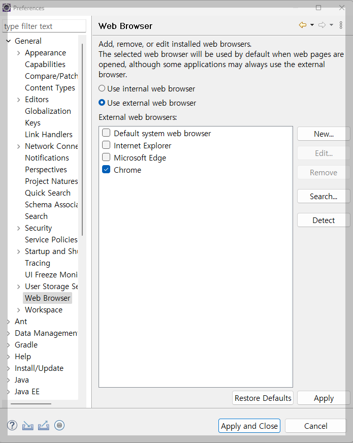 그 다음 General -> Web Browser 에서 Chrome 선택 후 apply