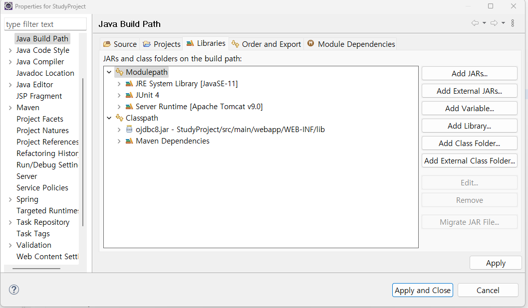 프로젝트 오른쪽 마우스 클릭 -> build path -> configure build path -> add library -> JUnit4 선택 후 apply